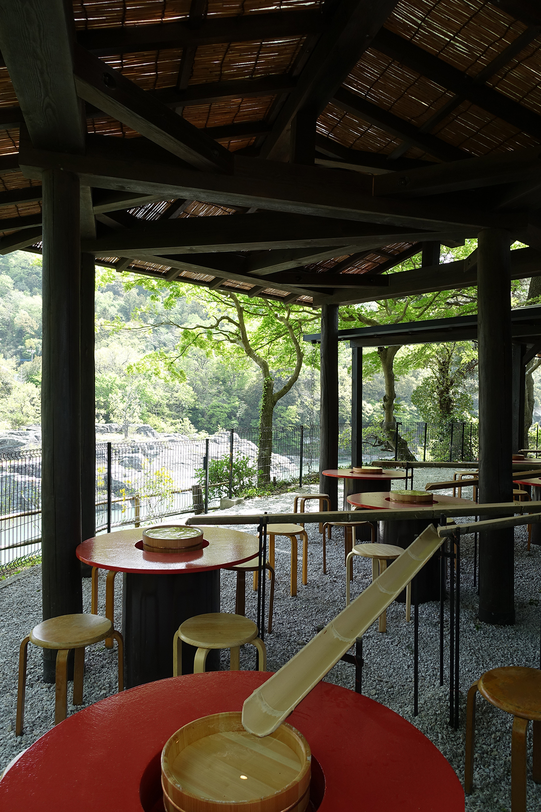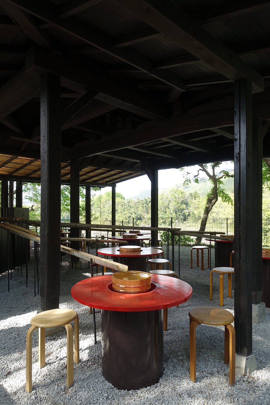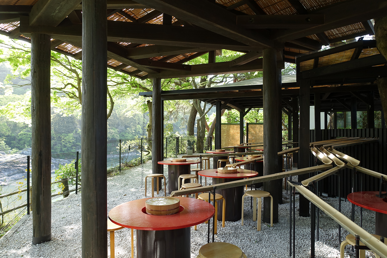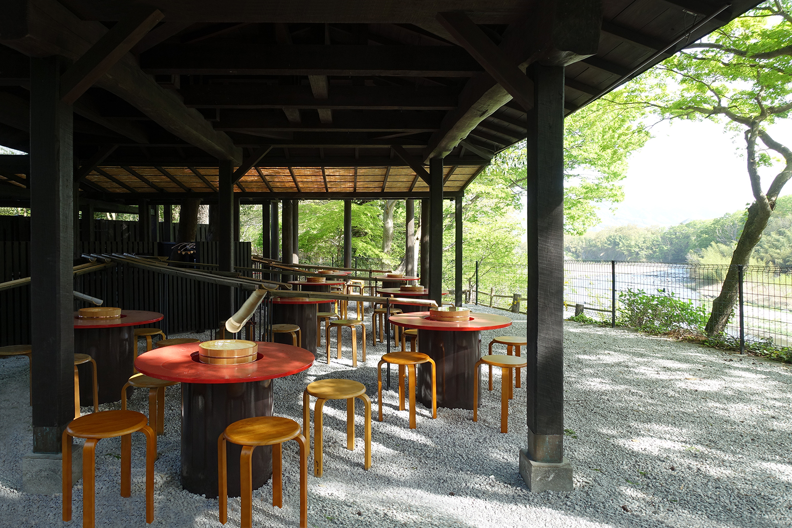 埼玉県秩父郡長瀞町にある老舗旅館「長生館」の敷地内にある流しそうめん店舗施設です。敷地の脇には荒川が流れ、景勝地として知られる「長瀞の岩畳」が正面に広がっています。調理場内のそうめんの流し手を中心に、周囲の大自然に向かって客席が放射状に広がり、それぞれの客席と大自然が1対1の関係となる配置計画としています。まわりにある川・岩・空・植物を、建物の床・壁・天井として見立て、内と外を隔てる壁はありません。そうめんを流すための竹を支持する部材は、できるだけ存在感を抑えるために細い鉄で製作しています。客席のある空間では、そうめんを流す竹だけが浮かび上がって感じることができるように、鉄の支持材が空間全体を支えています。同時に、テーブル天板の色は緑色の補色となる臙脂色として、周囲の自然の緑の中で鮮やかに映える色としています。