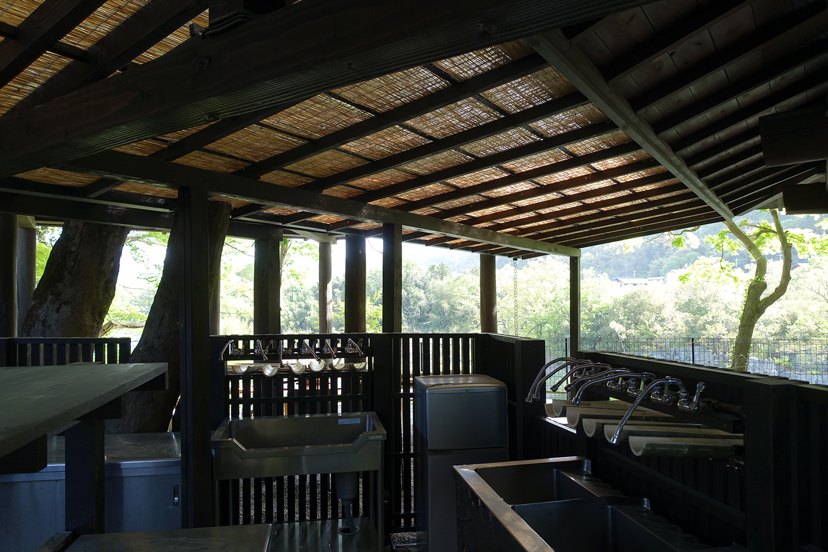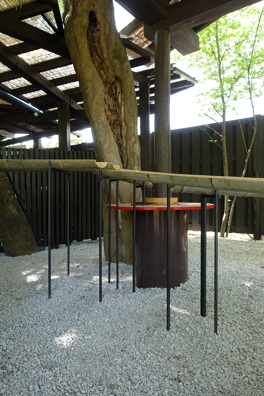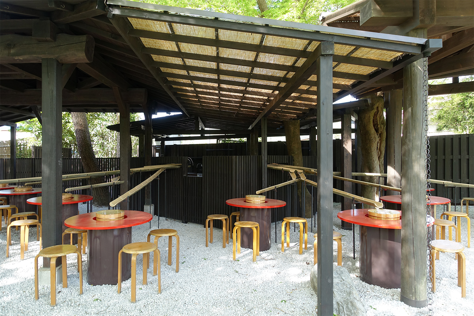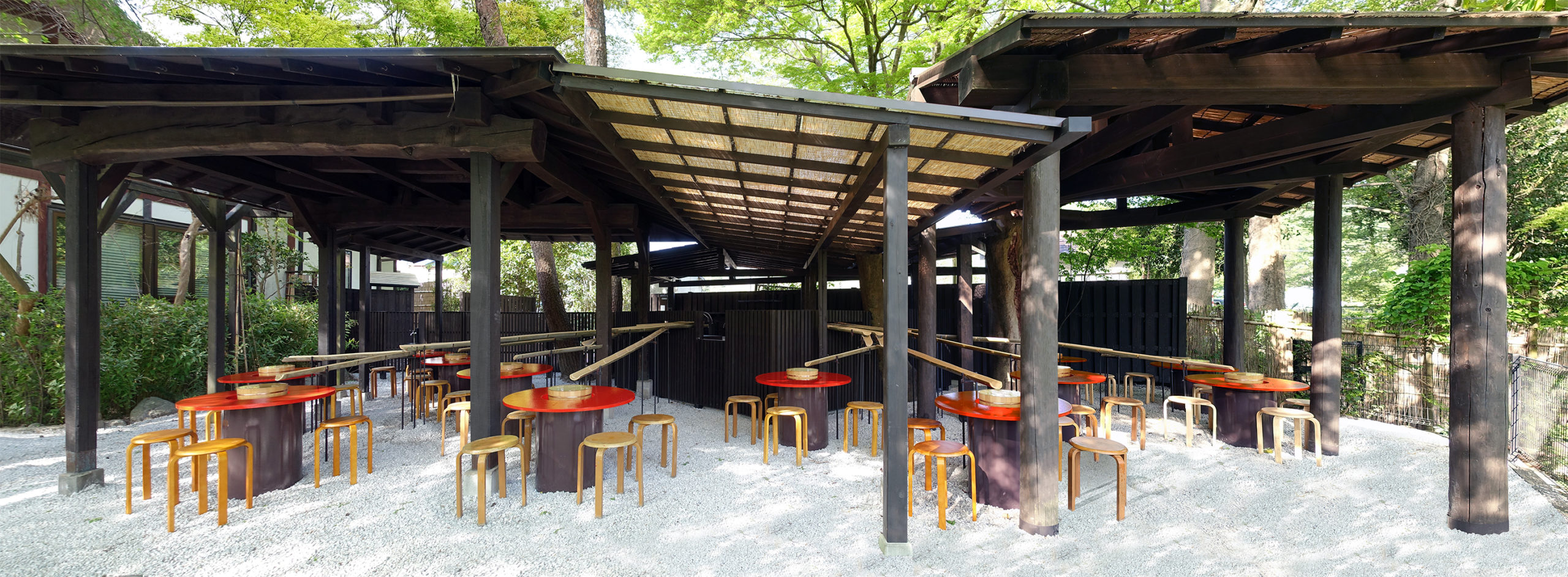 埼玉県秩父郡長瀞町にある老舗旅館「長生館」の敷地内にある流しそうめん店舗施設です。敷地の脇には荒川が流れ、景勝地として知られる「長瀞の岩畳」が正面に広がっています。調理場内のそうめんの流し手を中心に、周囲の大自然に向かって客席が放射状に広がり、それぞれの客席と大自然が1対1の関係となる配置計画としています。まわりにある川・岩・空・植物を、建物の床・壁・天井として見立て、内と外を隔てる壁はありません。そうめんを流すための竹を支持する部材は、できるだけ存在感を抑えるために細い鉄で製作しています。客席のある空間では、そうめんを流す竹だけが浮かび上がって感じることができるように、鉄の支持材が空間全体を支えています。同時に、テーブル天板の色は緑色の補色となる臙脂色として、周囲の自然の緑の中で鮮やかに映える色としています。
