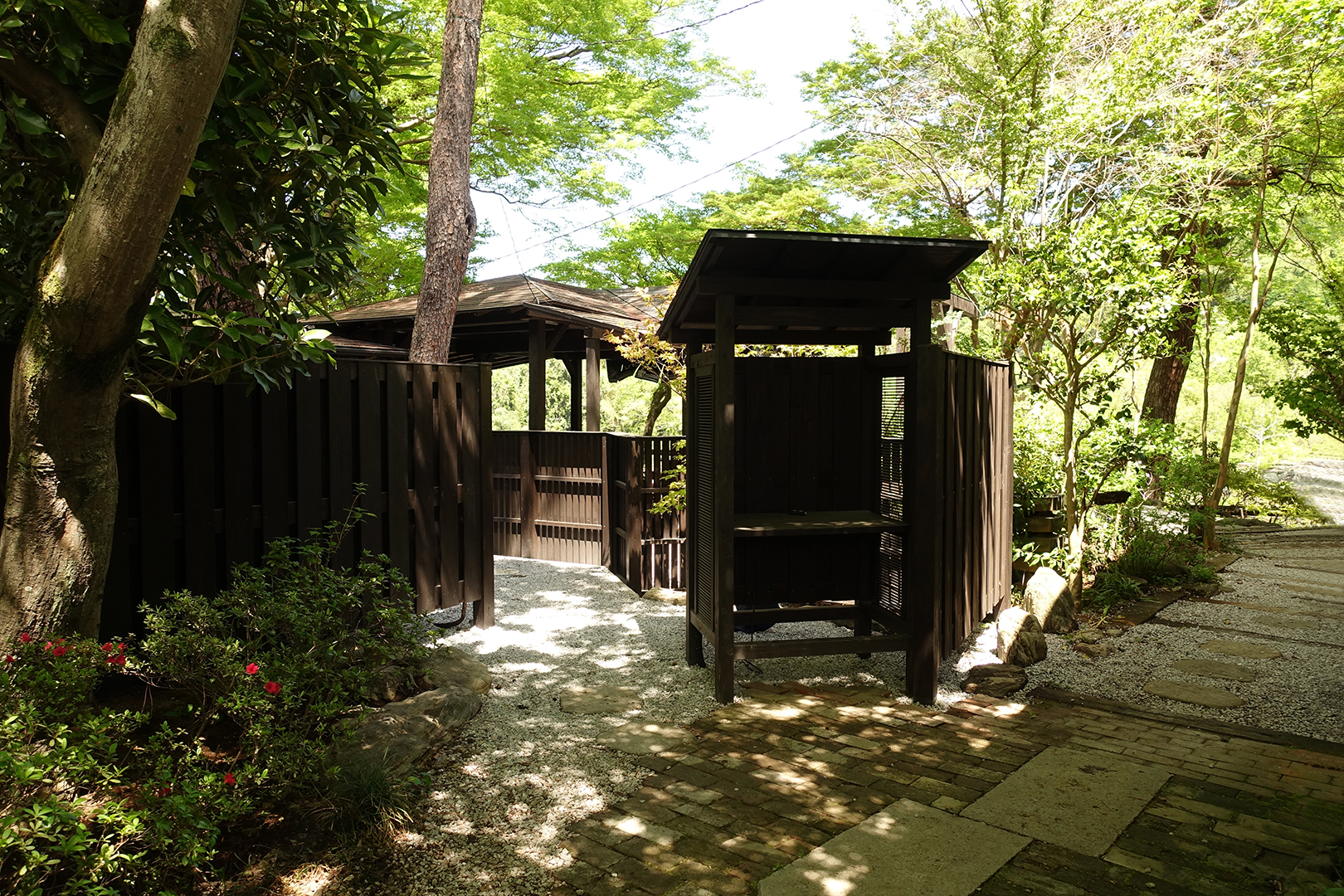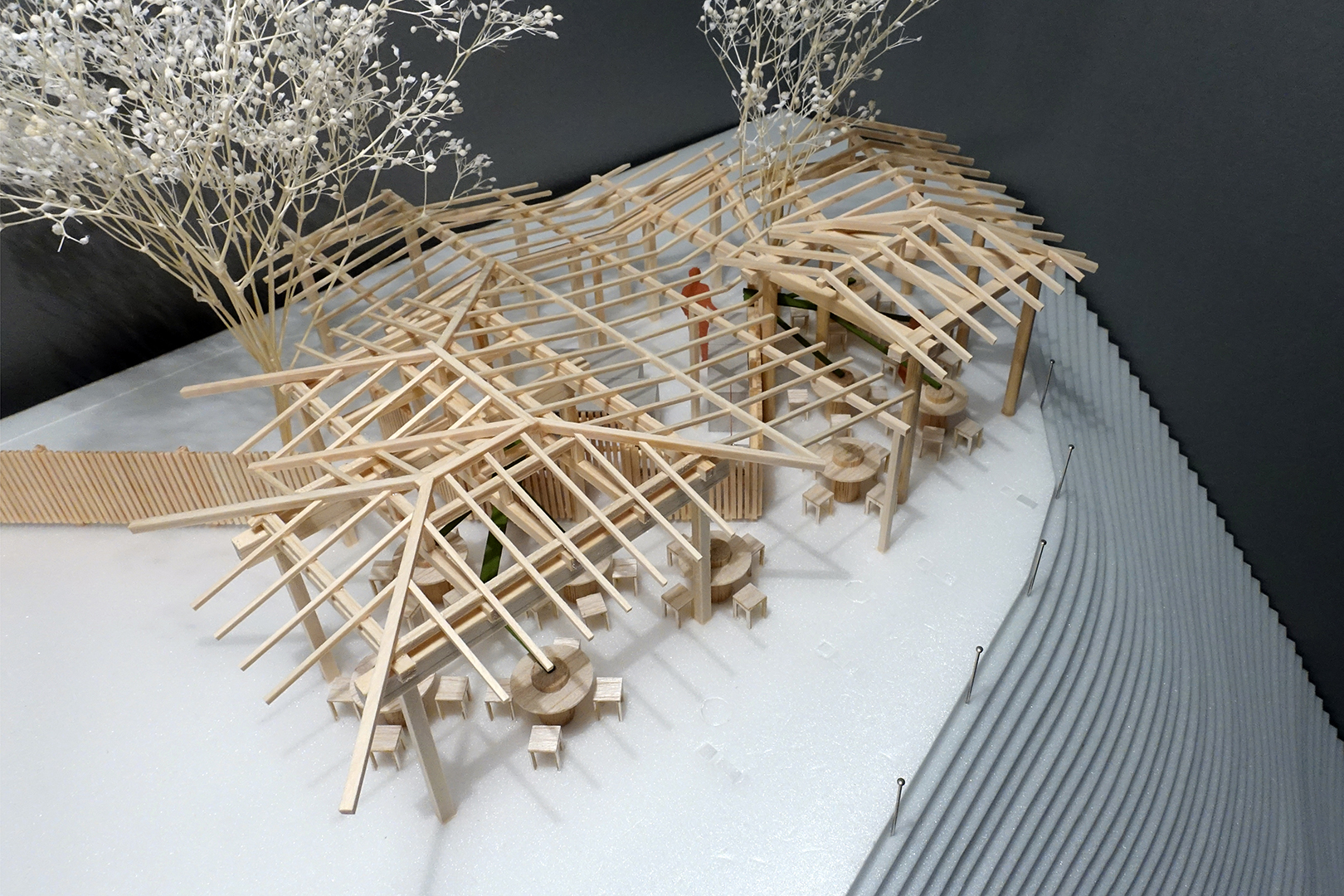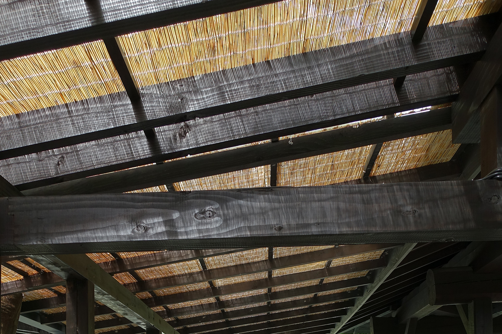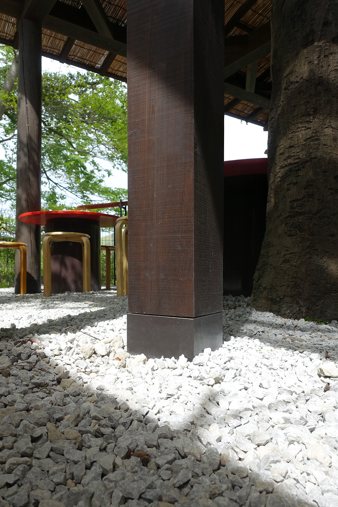 埼玉県秩父郡長瀞町にある老舗旅館「長生館」の敷地内にある流しそうめん店舗施設です。敷地の脇には荒川が流れ、景勝地として知られる「長瀞の岩畳」が正面に広がっています。調理場内のそうめんの流し手を中心に、周囲の大自然に向かって客席が放射状に広がり、それぞれの客席と大自然が1対1の関係となる配置計画としています。まわりにある川・岩・空・植物を、建物の床・壁・天井として見立て、内と外を隔てる壁はありません。そうめんを流すための竹を支持する部材は、できるだけ存在感を抑えるために細い鉄で製作しています。客席のある空間では、そうめんを流す竹だけが浮かび上がって感じることができるように、鉄の支持材が空間全体を支えています。同時に、テーブル天板の色は緑色の補色となる臙脂色として、周囲の自然の緑の中で鮮やかに映える色としています。